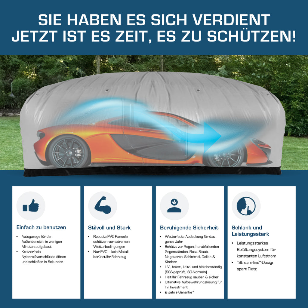 Ein kontinuierliches, gefiltertes Luftstromsystem beugt Kondensation vor und hält Ihr Auto trockener, sauberer und vor Rost und Feuchtigkeitsschäden geschützt . Der Outdoor Car Shield™ ist für den ganzjährigen Einsatz konzipiert, UV-beständig, feuerfest und hält Hitze und Kälte stand .