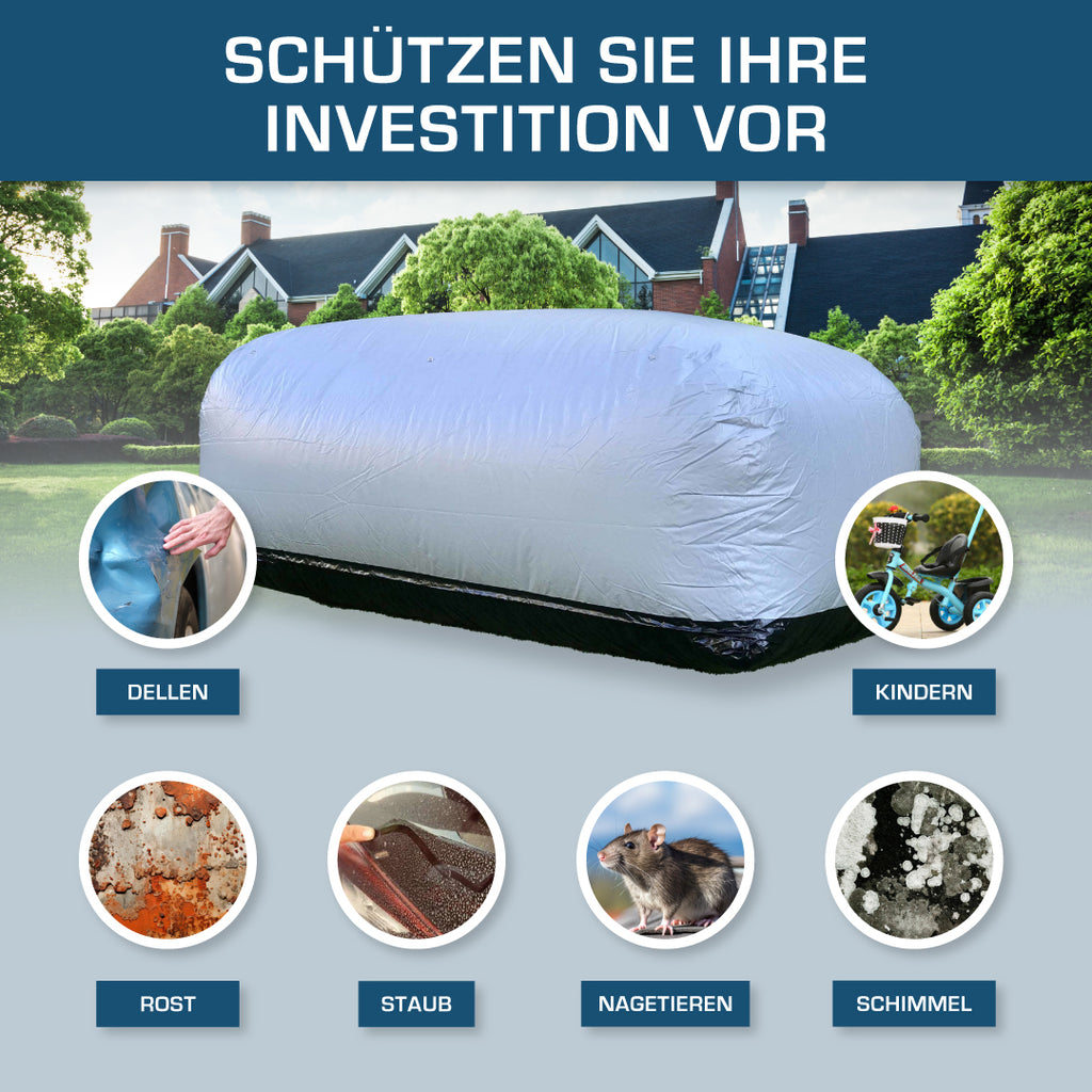 Schützen Sie Ihr Auto stilvoll mit unserer wetterfesten Autoabdeckung und Aufbewahrungslösung für den Außenbereich . Der Outdoor Car Shield™ ist in wenigen Minuten aufgebaut und umschließt Ihr Fahrzeug vollständig, sodass nichts Ihr Auto berührt .