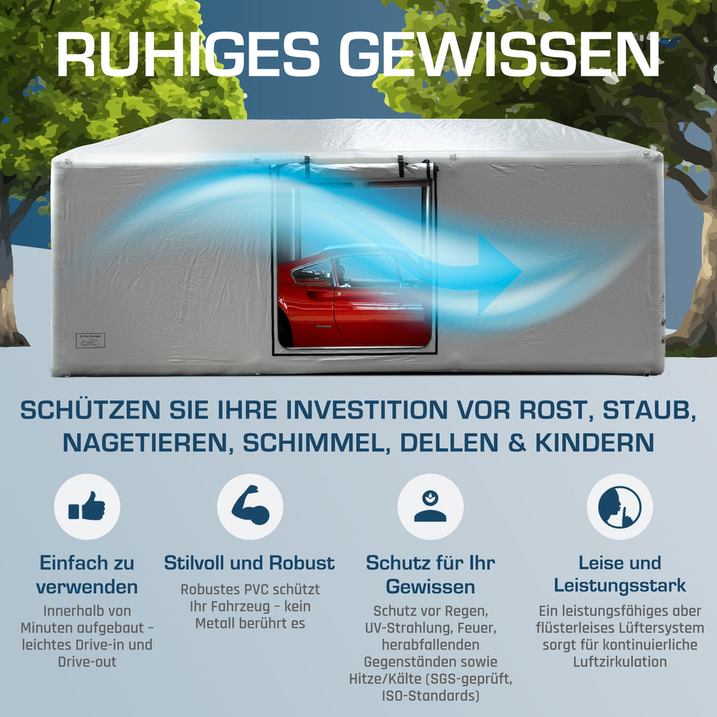 Schützen Sie Ihr Auto stilvoll mit unserer wetterfesten Autoabdeckung und der passenden Garagenaufbewahrungslösung für den Außenbereich. Der Ultimate Outdoor Car Shield™ ist in wenigen Minuten aufgebaut und bietet umfassenden Schutz – ganz ohne Metallteile, die Ihr Fahrzeug berühren.