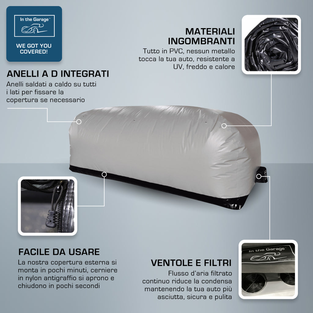 Un sistema di flusso d'aria filtrato continuo aiuta a prevenire la condensa, mantenendo la tua auto più asciutta, pulita e protetta dalla ruggine e dai danni causati dall'umidità. Progettato per l'uso tutto l'anno, l'Outdoor Car Shield™ è resistente ai raggi UV, al fuoco e costruito per sopportare caldo e freddo.
